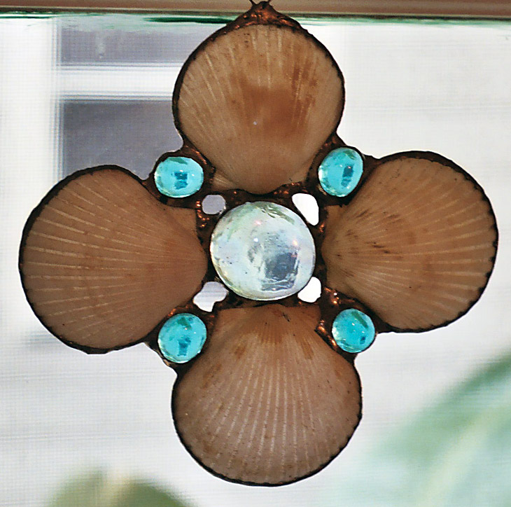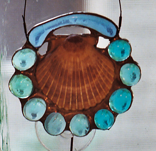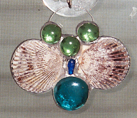| Scallop shells take on wing-like properties when combined with green and blue rounds 5" x 4" |