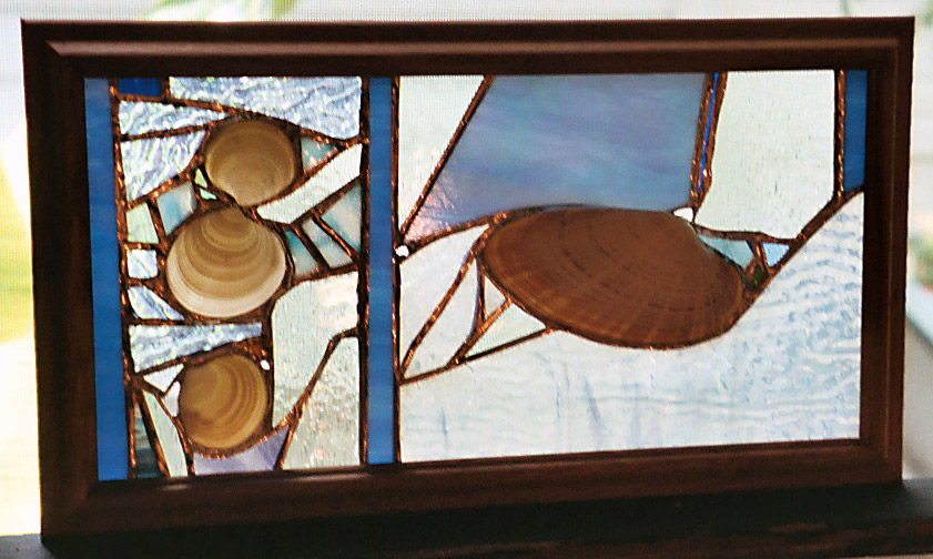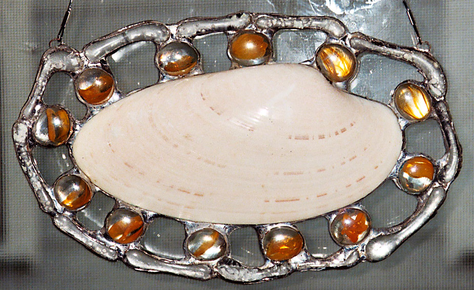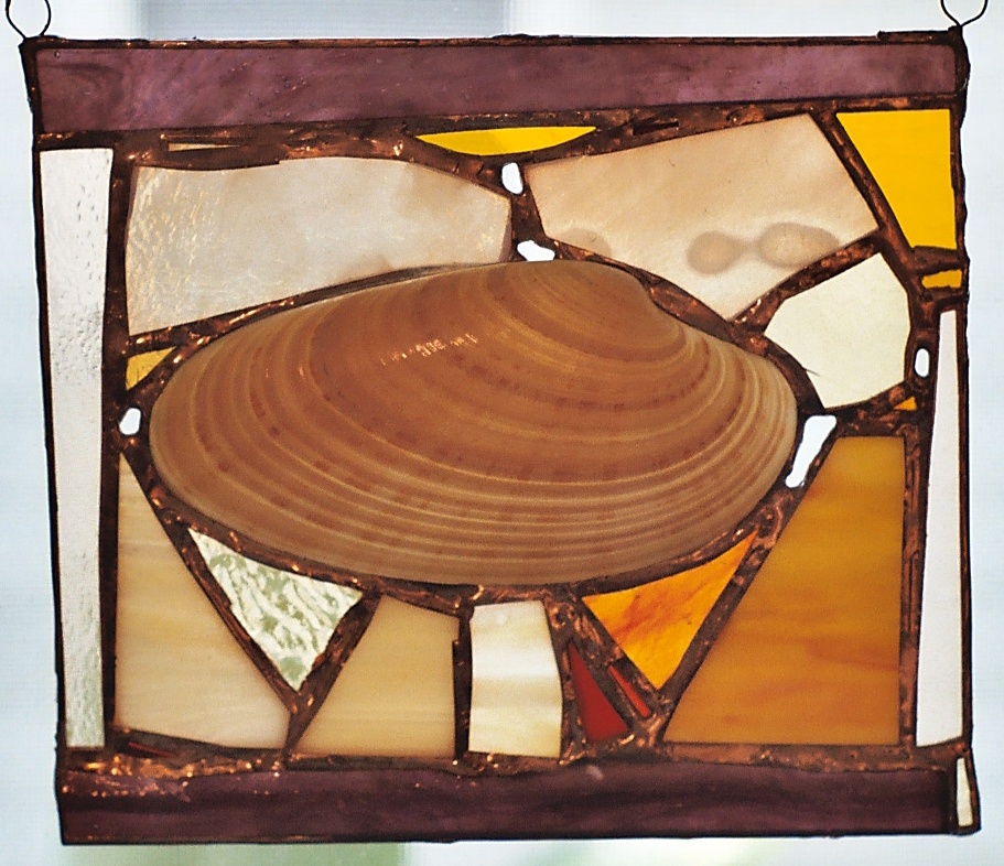 | Warm and Serene! The natural colors of a large Sunray Venus shell are echoed in the colors of the glass on this piece. 8 1/2" x 8" |
