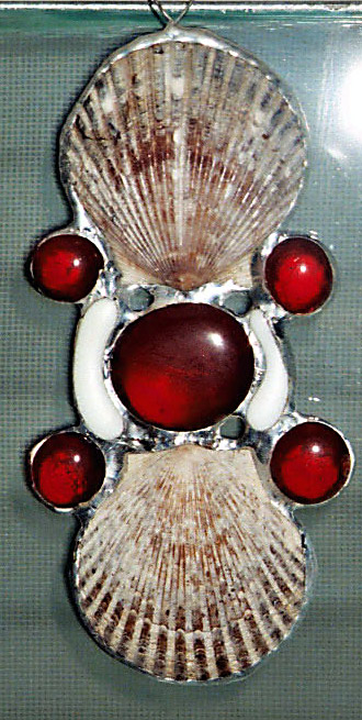 | Red "rounds", opaque white "longs" and two natural scallop shells combine for a big impact in this small piece 3" x6" |