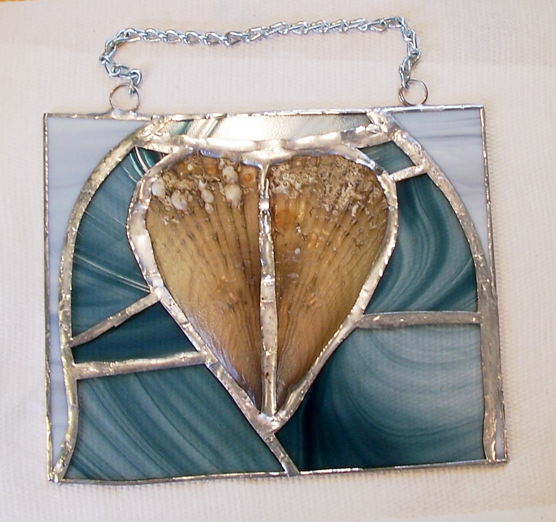 | Light and lacy, intact pair of small pen shell halves open out to form a heart... surrounded by rippled blue and clear swirl glass with opaque white edges forming an arch Really gorgeous against a white wall or in a window aprox 7 x 6 |