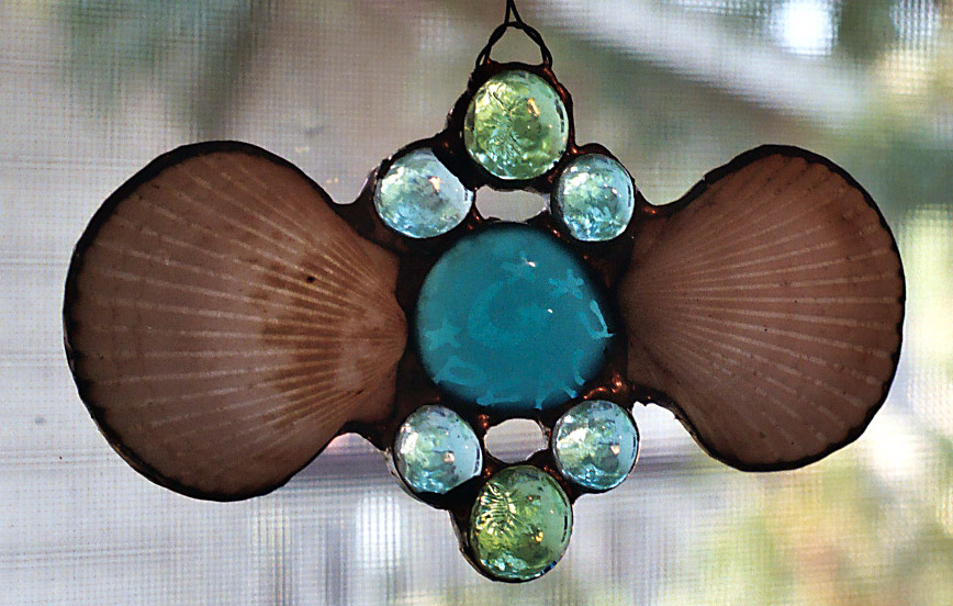| "Peace" be with you. Center aqua round sends a peaceful message with help from 2 scallop shells 6" x4" |