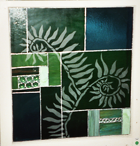 | Fern-tastic! Rich greens set off this striking organic etching. Comes set into a refurbished window frame 28 x 28 |
