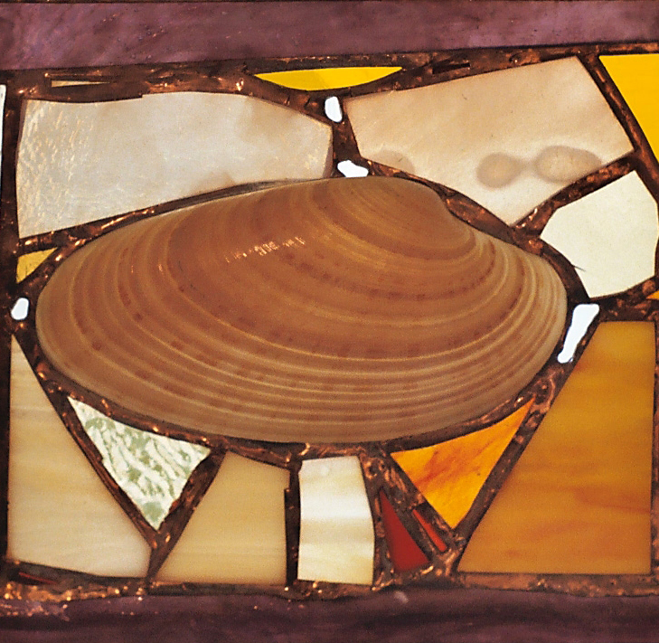| Another good sized Sunray Venus shell languishes in cool green, purple and blue tones 7" x 7" |